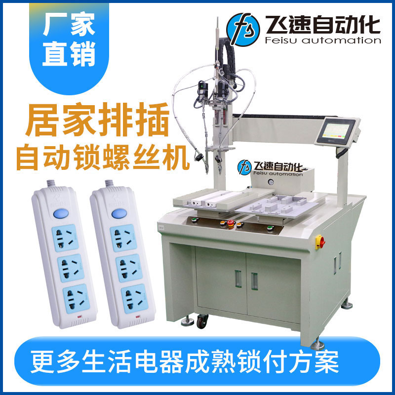 那么排插在生產(chǎn)線進(jìn)行大批量產(chǎn)品生產(chǎn)、加工、裝配時,涉及到螺絲安裝的時候,需要人工手工完成,人工不僅需要對工件進(jìn)行夾緊定位,還需要人工操作提供螺絲、對螺絲進(jìn)行定位和操作手動擰螺絲工具,對操作人員的技術(shù)方面難度加大了一點,同時還會降低加工效率,并且也帶來了大量人工成本的提高等,針對這一問題,飛速自動化根據(jù)產(chǎn)品設(shè)計一臺自動加擰緊工螺絲設(shè)備可以在流水作業(yè)時,自動輸送、自動供料、自動夾緊工件、自動分螺絲方向、自動定位、自動找正螺孔、自動扭緊的自動加工螺絲設(shè)備,以解決人工完成上述操作帶來的產(chǎn)品一致性差、操作效率低以及人工成本高的問題。 排插的外殼體需8顆螺絲鎖付,螺絲類型為內(nèi)十字圓頭螺絲,為提高效率。