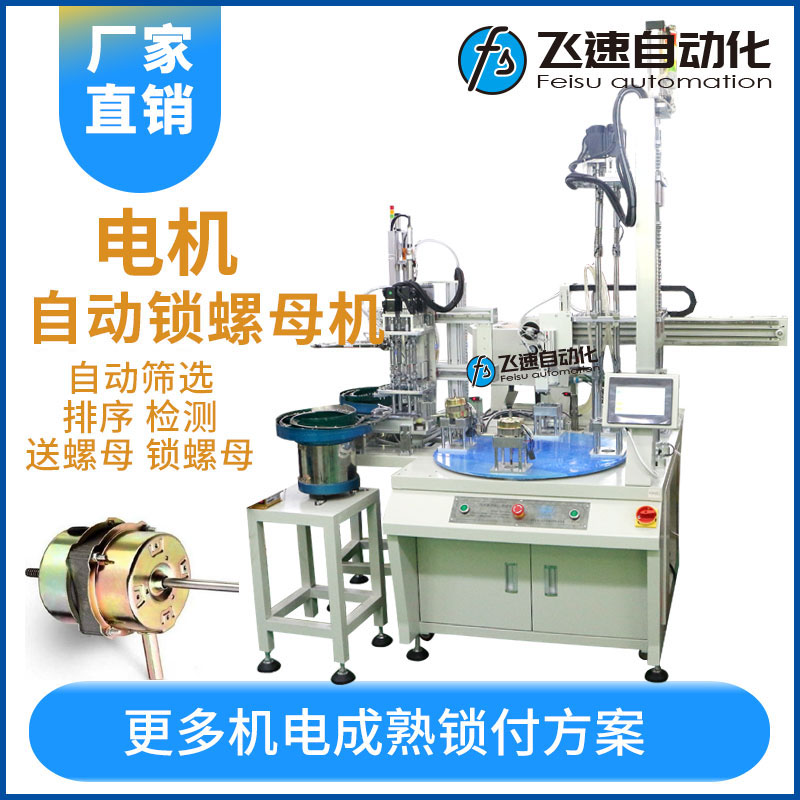 - 產(chǎn)品簡(jiǎn)介: 風(fēng)扇電機(jī)自動(dòng)鎖螺母機(jī)自動(dòng)送螺母、擰螺母、取產(chǎn)品均由設(shè)備自動(dòng)完成。 電機(jī)風(fēng)扇是一種具有風(fēng)扇轂和葉片的電機(jī),其作用是產(chǎn)生驅(qū)動(dòng)轉(zhuǎn)矩的動(dòng)力源,風(fēng)扇電機(jī)主要由外殼、設(shè)于外殼內(nèi)的轉(zhuǎn)子、固設(shè)于外殼內(nèi)壁上且繞轉(zhuǎn)子設(shè)置的定子及端蓋組成。在組裝生產(chǎn)種需要用的五金標(biāo)準(zhǔn)件之一的螺絲進(jìn)行安裝緊固,廠家生產(chǎn)一直都是傳統(tǒng)人工進(jìn)行手工產(chǎn)品進(jìn)行裝配一枚一枚螺絲擰緊或者采用一種電動(dòng)螺絲刀來操作,在生產(chǎn)上不僅勞動(dòng)強(qiáng)度大,生產(chǎn)效率低,而且在擰緊工件時(shí)無法控制力度,出現(xiàn)旋緊力不均或者容易滑牙等問題造成不良產(chǎn)品。 為此廠家會(huì)選購(gòu)一臺(tái)自動(dòng)化螺絲機(jī)來代替繁瑣的工作和提高工作效率 質(zhì)量等,飛速自動(dòng)化生產(chǎn)的轉(zhuǎn)臺(tái)式多軸自動(dòng)鎖螺絲機(jī),設(shè)備配置了一個(gè)轉(zhuǎn)臺(tái)多個(gè)工位操作,設(shè)備上配置了兩臺(tái)振動(dòng)盤自動(dòng)定向排序的送料設(shè)備,其工作目的是通過振動(dòng)將螺絲自動(dòng)有序定向排列整齊、準(zhǔn)確地輸送到轉(zhuǎn)臺(tái)操作工位上然后由四軸把螺絲放置在配置好的工件上進(jìn)行轉(zhuǎn)動(dòng)扭緊螺絲釘,將擰好螺絲的產(chǎn)品由機(jī)械手自動(dòng)送入出料倉(cāng),人工無需再去取產(chǎn)品,個(gè)過程都通過轉(zhuǎn)盤同時(shí)進(jìn)行,各工位互不干擾,設(shè)備優(yōu)勢(shì)在于減少人工作業(yè)量,工人放置產(chǎn)品即可,送螺母、擰螺母、取產(chǎn)品均由設(shè)備自動(dòng)完成。