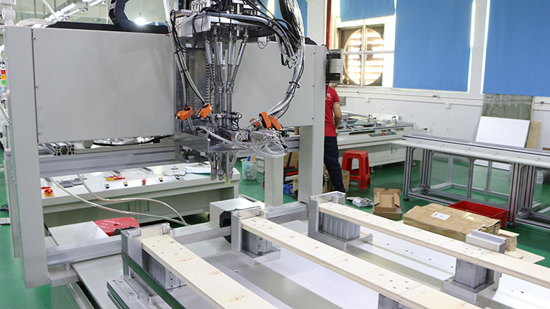 本案例是鎖卡板上的螺絲,由于產(chǎn)品比較大,所以采用伺服龍門坐標(biāo)式自動(dòng)鎖螺絲機(jī),產(chǎn)品用獨(dú)立升降氣缸鎖付,機(jī)器共有6個(gè)軸,一次可以鎖6顆螺絲。